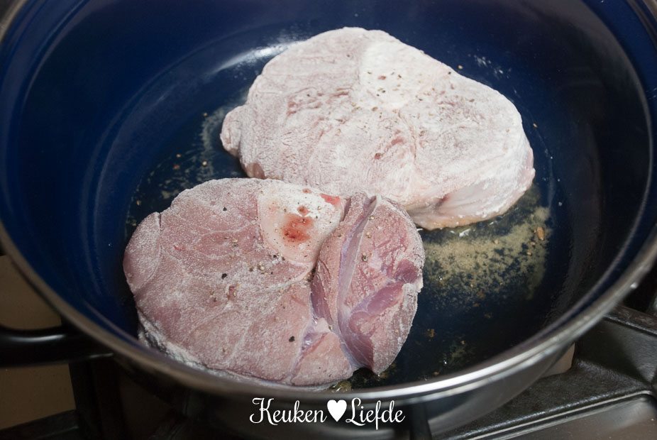 Verhit de braadpan en laat heet worden. Dep het vlees met keukenpapier droog en bestrooi met peper en zout. Doe de bloem in een ruime kom en wentel het vlees door de bloem. Klop het overtollige bloem eraf. Doe een scheutje olie in de braadpan en leg het vlees in de pan, niet al het vlees tegelijk. Braad het vlees aan de beide kanten even kort bruin en haal het uit de pan. Leg de kalfsschenkels op een bord en zet opzij.