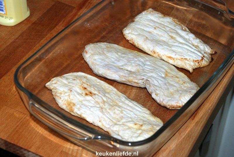 Je zou de schnitzels ook in repen kunnen snijden, dat schept straks wat makkelijker op en ziet er iets smakelijker uit. Leg de schnitzels in een licht ingevette ovenschaal.