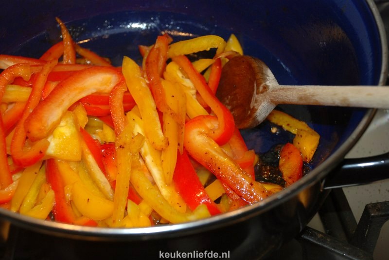 Bak in het braadvet van het vlees de paprika’s samen met de paprika- en chilipoeder.