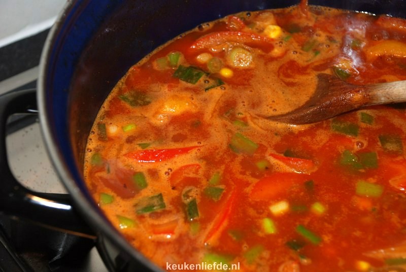Voeg na 3 minuten de lente-ui toe en bak even mee. Voeg dan het bouillonblokje, tomatensaus en water toe en laat circa 1 minuut doorkoken. Roer de mais erdoor.