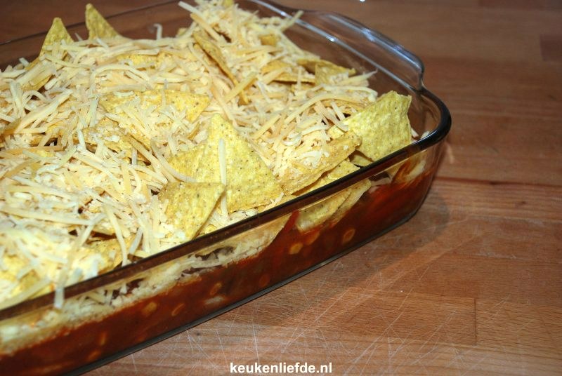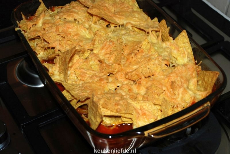 Het moet een vrij dikke saus worden. Als je de saus te dun vindt kun je hem binden met een papje van maizena en water. Giet de saus over de schnitzels en bedek tot slot met de tortilla chips en geraspte kaas.