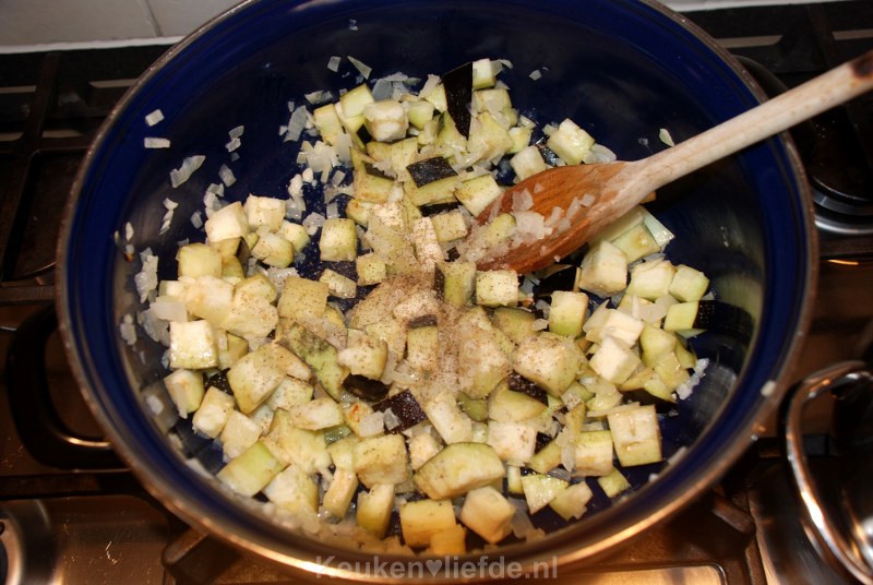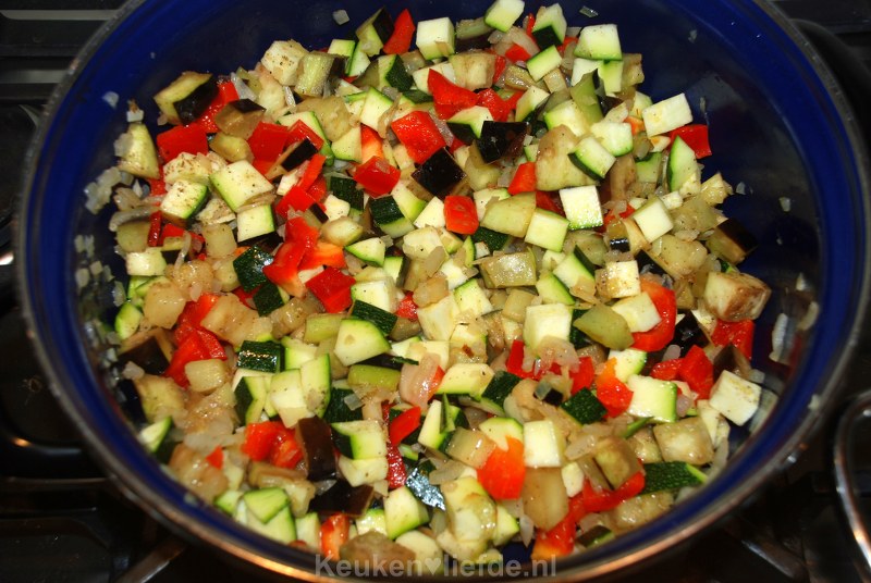 Aubergine neemt veel vocht op, dus voeg indien nodig wat extra olijfolie toe om te voorkomen dat de aubergine droog wordt of aanbakt. Breng goed op smaak met zout en peper. Voeg dan de paprika en courgette toe en bak weer enkele minuten verder. Breng weer op smaak met zout en peper.