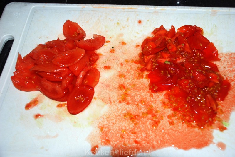 Breng een pannetje met water aan de kook, voeg de tomaten toe en haal ze er na 4 seconden weer uit. Snijd ze in vieren en verwijder het vel en het sap/zaadlijsten; deze mag je weggooien.