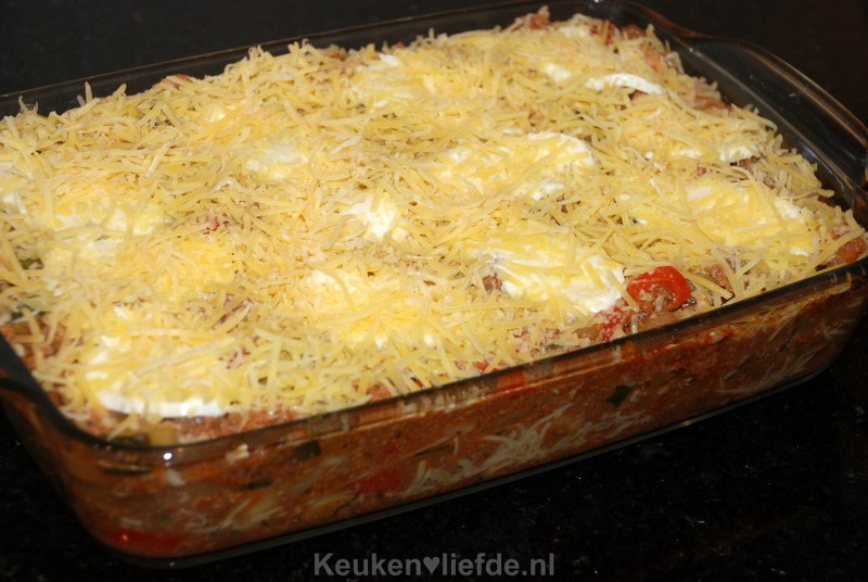 Eindig met de gehaktsaus, plakjes mozzarella en geraspte kaas.