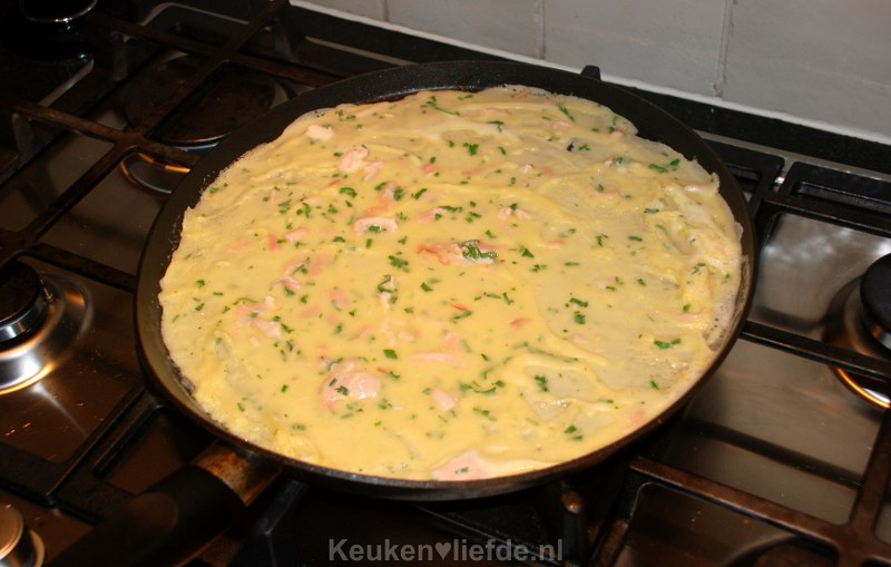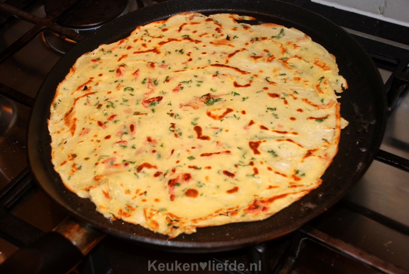 Bak de pannenkoeken volgens recept, maar voeg extra de helft van de ham en peterselie toe aan het beslag.