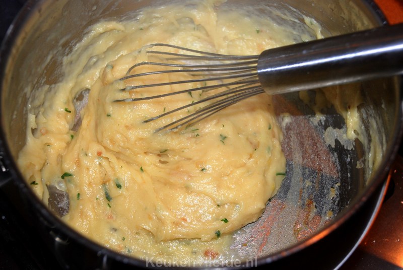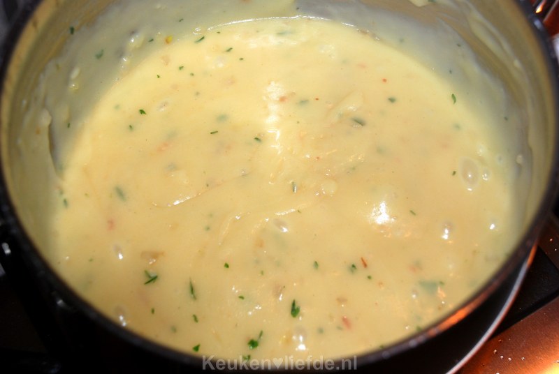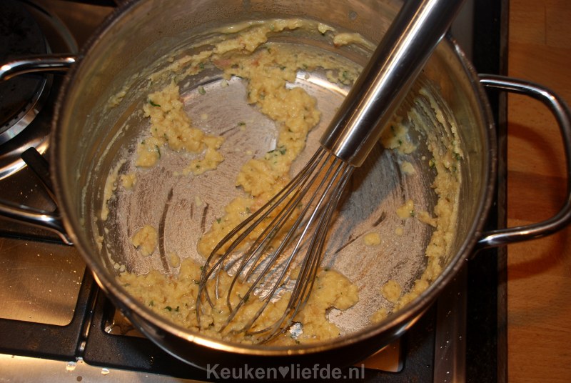 Voeg al roerend, zoveel bouillon toe (je hoeft dus niet alle bouillon te gebruiken) totdat je een dikke saus hebt.