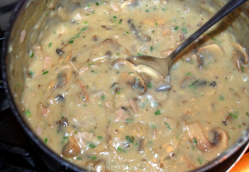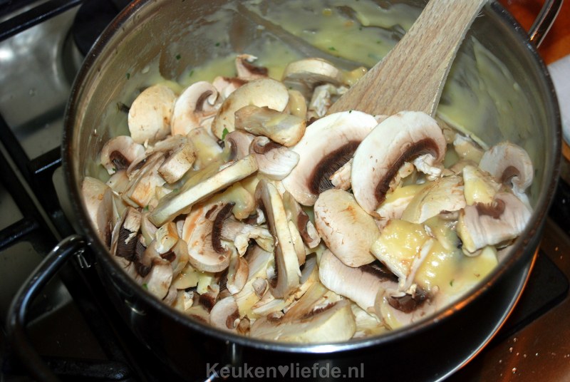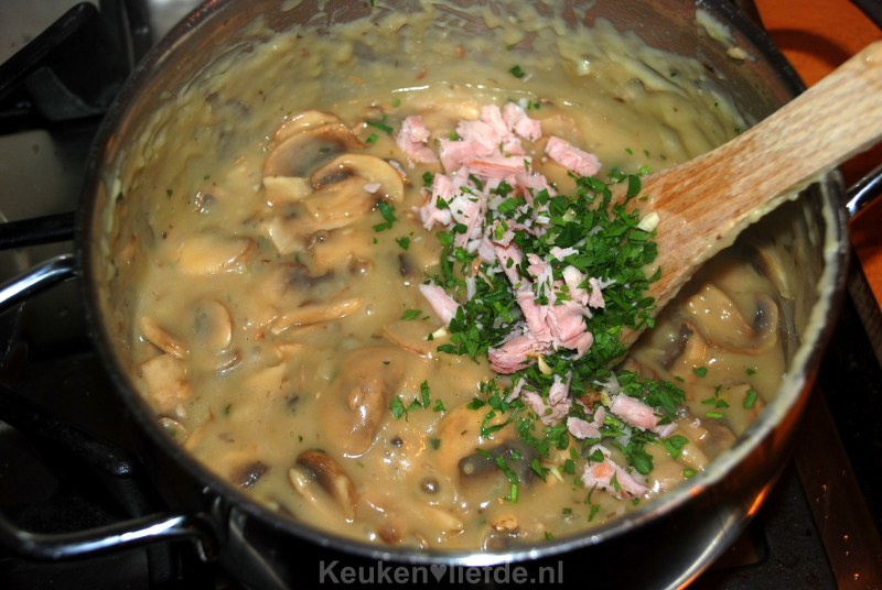 Laat de champignons in de ragout zacht worden. Het vocht uit de champignons zorgt ervoor dat de saus wat dunner wordt. Je kunt natuurlijk ook de champignons eerst bakken en daarna pas toevoegen aan de ragout. Het vocht is dan al uit de champignons, dus mag de saus wat dunner zijn. Roer op het laatste moment de overige peterselie en ham erdoor en breng de ragout eventueel verder op smaak met zout en peper.