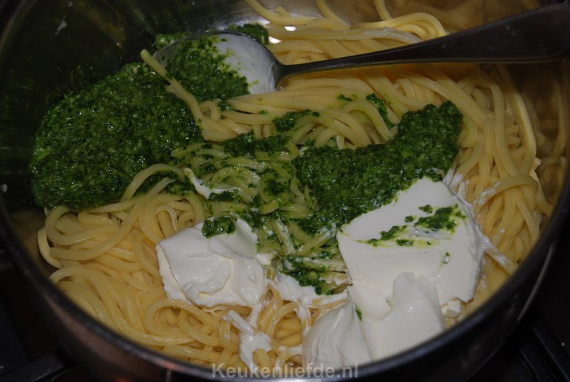 Heerlijk! Snel klaar en heel smakelijk. Het enige: de pasta werd een beetje plakkerig. De volgende keer spoel ik eerst met koud water, warm het weer op met een beetje olie en doe er daarna de crème fraîche en pesto bij.