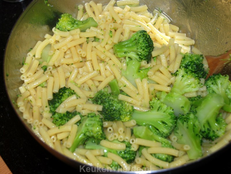 Verwarm de oven voor op 200 graden. Snijd de broccoli in kleine roosjes en schil de broccolistronk. Snijd de stronk in plakken. Kook de broccoli beetgaar en giet af in een vergiet. Kook daarna de pasta beetgaar en voeg toe aan de broccoli, in het vergiet.