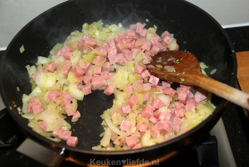 Verhit een koekenpan met wat olie en fruit op laag vuur de uien en knoflook totdat ze zacht zijn. Voeg de hamblokjes en Italiaanse kruiden toe en bak even mee. Breng op smaak met peper en zout.
