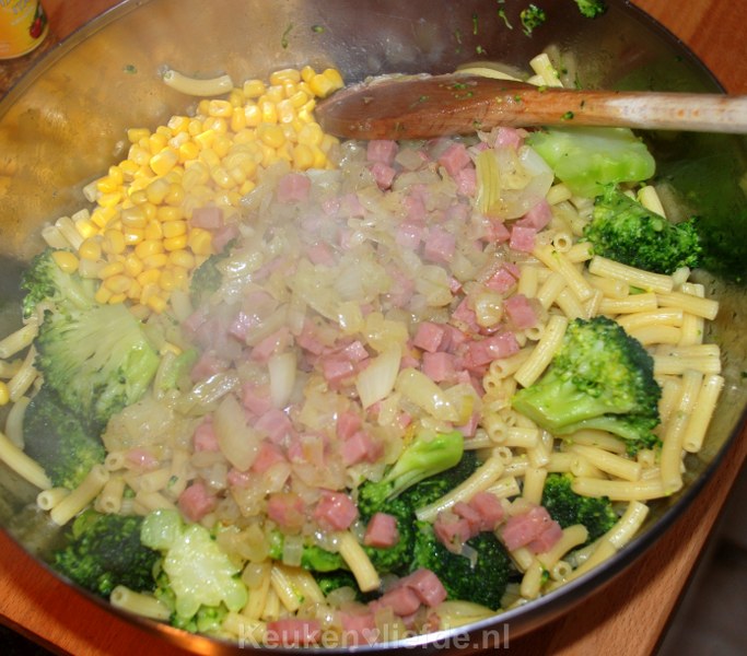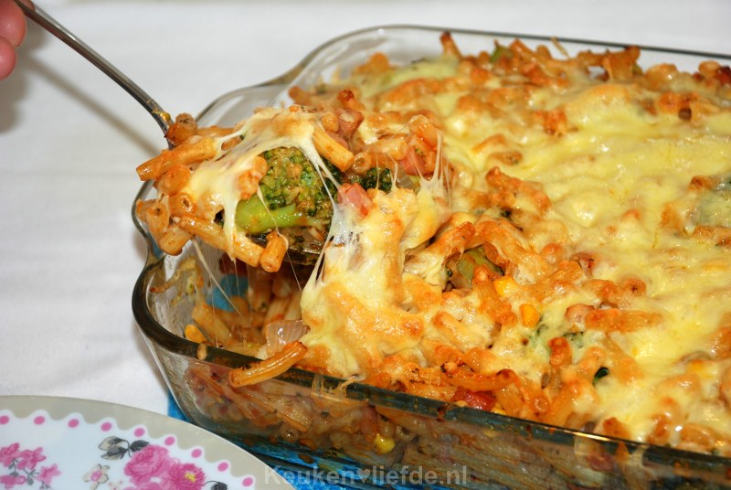 Pasta-ovenschotel met broccoli, ham en mais