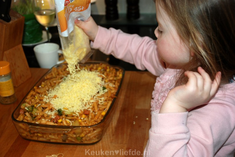 Verdeel de pasta in een ingevette ovenschaal en verdeel de geraspte kaas erover.
