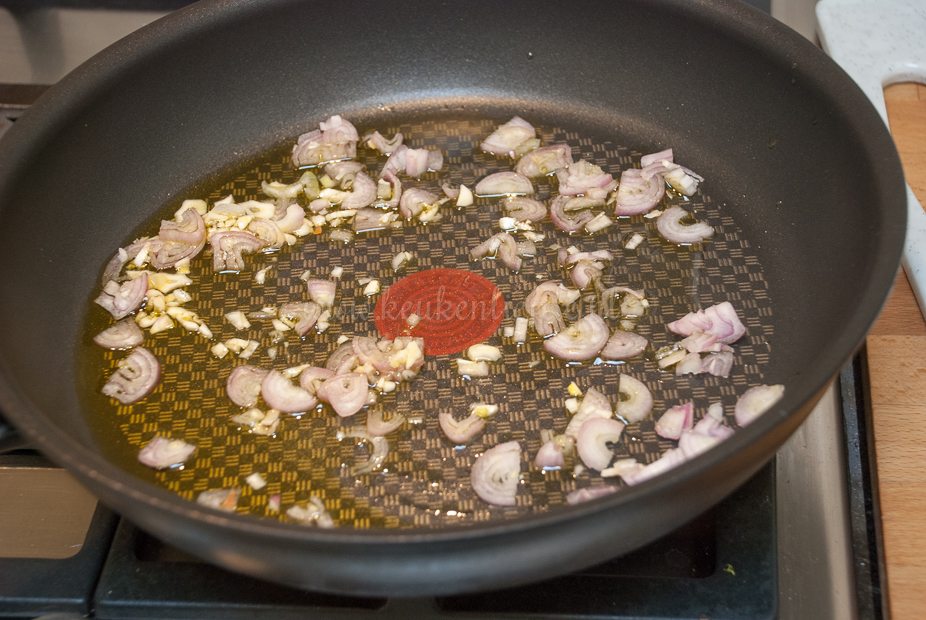 Giet de pasta af en doe samen met een flinke scheut van het kookvocht terug in de pan. Voeg eventueel een scheutje olijfolie toe en hussel om.