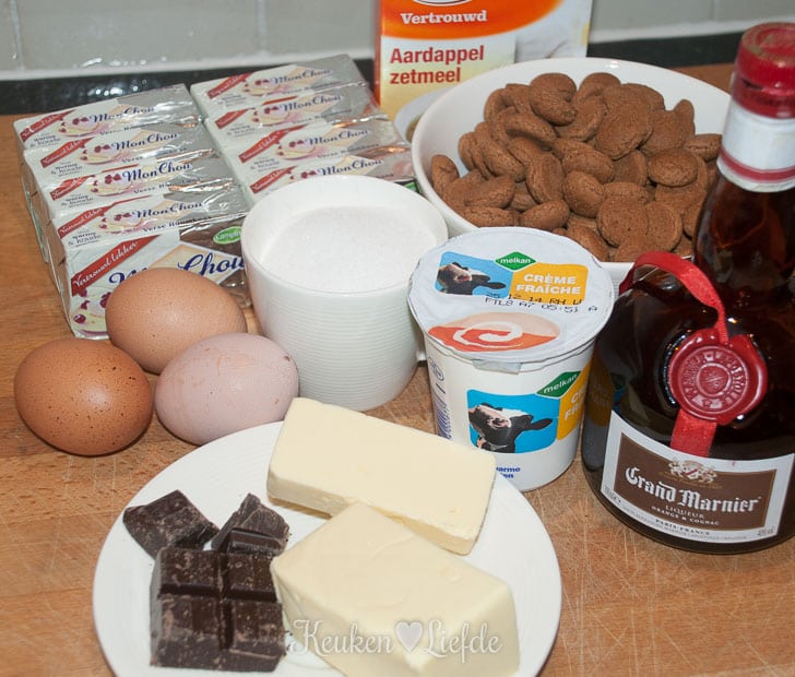 Mix tot een glad mengsel. Voeg 1 el Grand Marnier en de créme fraîche toe en klop glad. Voeg tot slot het aardappelzetmeel toe en roer dit met een spatel door het beslag, totdat alles is opgenomen. Giet het beslag over de bodem in de bakvorm en strijk de bovenkant glad.