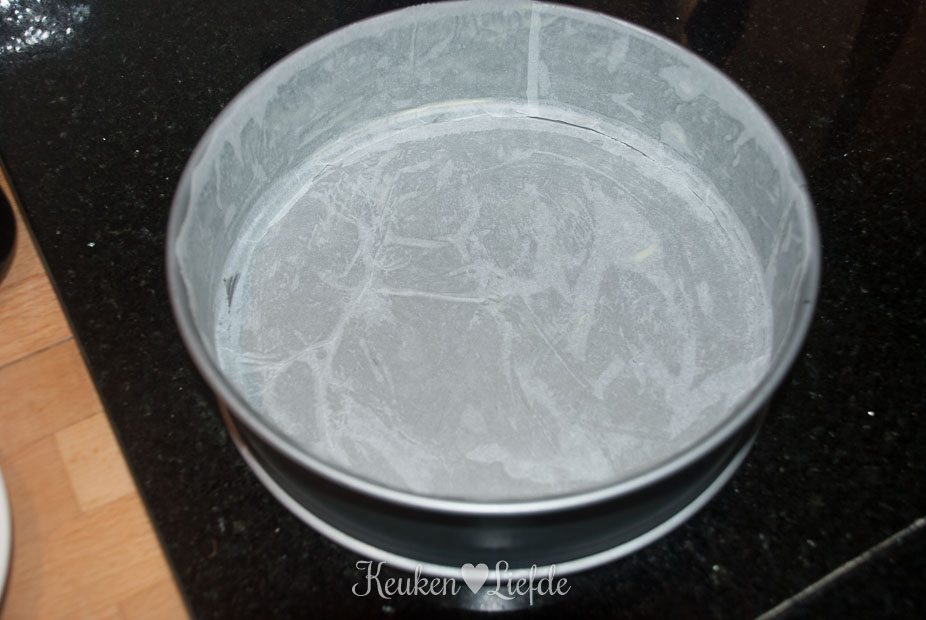 Vet de springvorm in met boter. Knip de bodem en de randen van de bakvorm uit bakpapier en bekleed de vorm ermee (dit voorkomt dat de cheesecake na het bakken gaat scheuren).