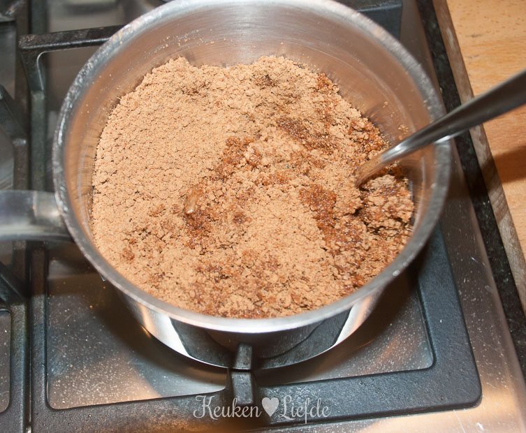 Verwarm de oven voor op 150 graden. Smelt de boter in een steelpannetje en vermaal ondertussen 200 gram pepernoten tot fijne kruimels in de staafmixer. Voeg de kruimels toe aan de boter en roer goed door.