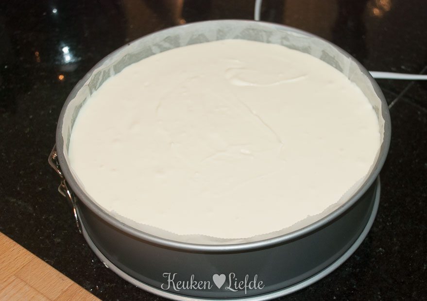 Hij staat NU in de oven :-). Heb als extra toevoeging nog 200 gr gesmolten witte chocolade door het cheese-mengsel gegoten. Ben benieuwd!