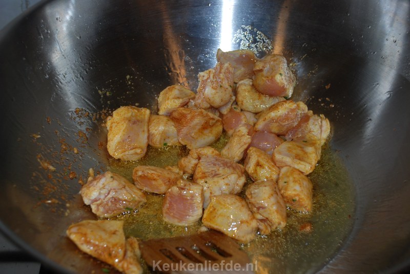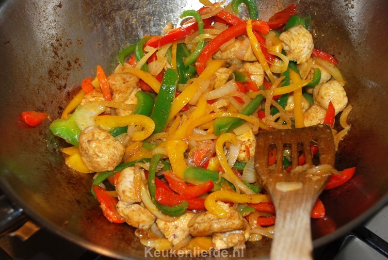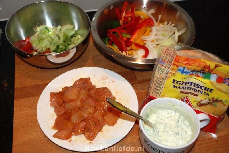 Bereid de salade en eventueel de knoflooksaus en zet deze vast klaar. Snijd de kipfilet in repen of blokjes en kruid ze met de shoarmakruiden. Verhit een wokpan met wat olie en bak de kip op hoog vuur snel aan alle kanten dicht. DSC_1592_800x536Schep de kip op een bord en dek af met aluminiumfolie. De kip hoeft nog niet helemaal gaar te zijn. Verwarm de pitabroodjes volgens de beschrijving op het pak. Bak in hetzelfde braadvet de uien, paprika en knoflook met 1 el shoarmakruiden.DSC_1594_800x536Als de groenten bijna beetgaar zijn voeg je de kip weer toe en bak alles nog ongeveer een minuut op hoog vuur tot de kip gaar is.
