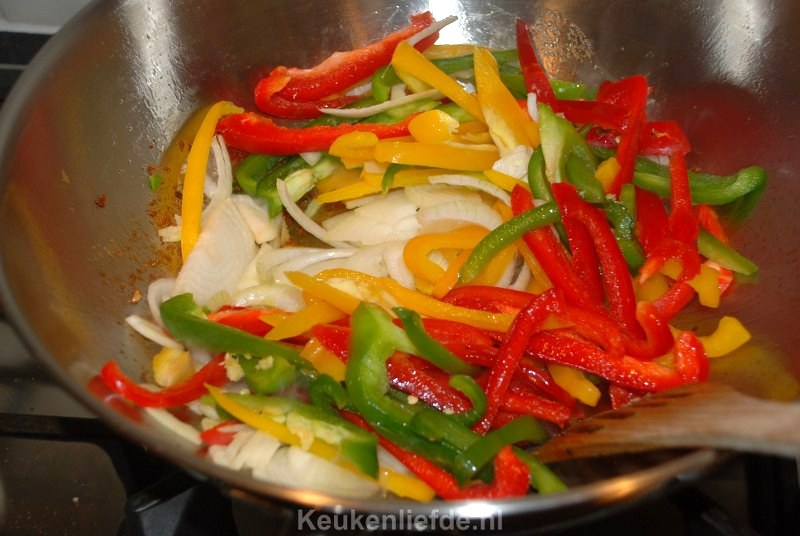 1 rode paprika, in repen of blokjes gesneden (wij gebruikten er drie maar dit was misschien iets teveel van het goede :))