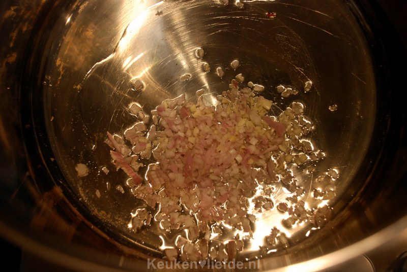 Maak de sjalot en de teen knoflook schoon en snij deze fijn. Verhit in een pan een klein beetje zonnebloemolie en fruit hier de sjalot en knoflook in aan.