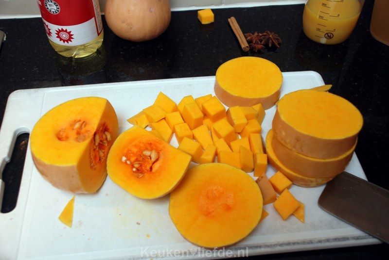Schil de pompoen, verwijder de pitten en snij de pompoen in gelijke stukken.