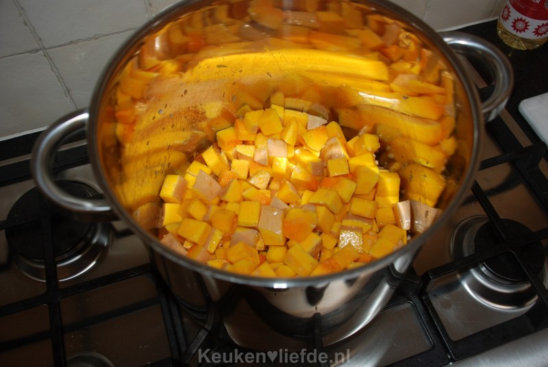 Voeg de stukken pompoen toe en bak deze ook even kort aan.