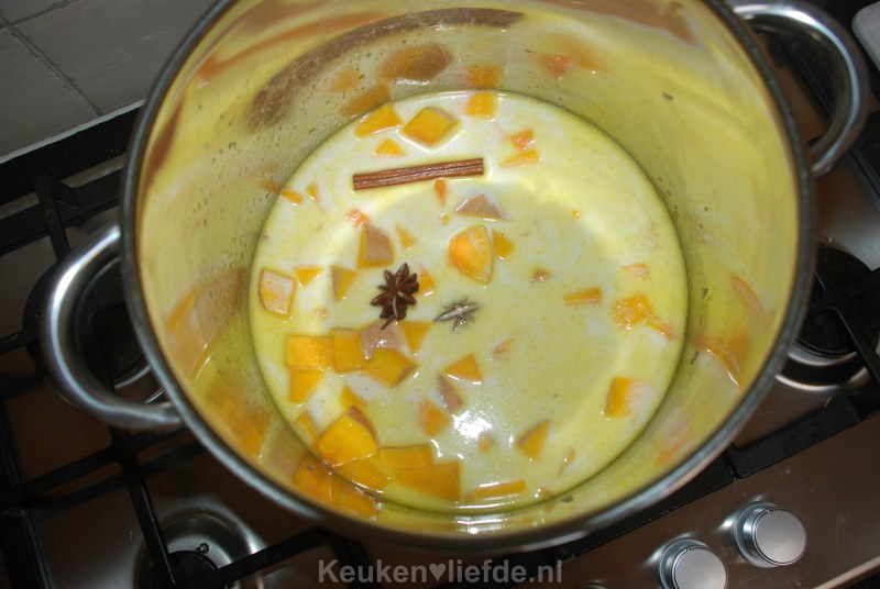 Wanneer de pompoen gaar is, de steranijs en kaneel eruit halen.