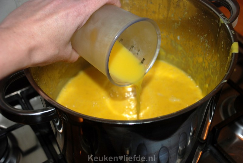 Eventueel de soep zeven als er grote stukken in blijven zitten. Voeg het sinaasappelsap toe, warm de soep nog even door, en breng de soep op smaak met zout.