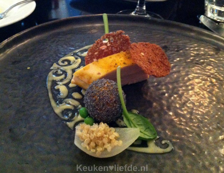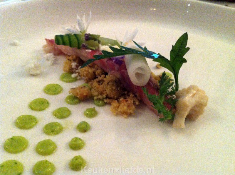 Ik zal het verklappen: geschaafde eendenlever … met gekonfijte kwee-appel en stukjes knetterchocolade! Juist, dit was niet lekker, dit was hemels! Mijn ervaring met eendenlever was nooit om over naar huis te schrijven, maar hierover schreef ik Annemiek direct een sms’je: ‘Je weet niet wat je mist!’ Dit was zó zalig, wauw. Ook de presentatie was top. Wederom een subliem gerecht.