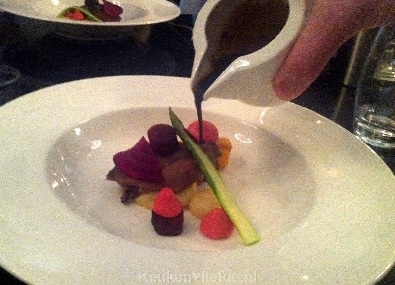 Lamsschenkel met rode biet, groene asperge en pastinaak. Bijna de hele keukenbrigade kwam tegelijk de keuken uit om ons gerecht af te ronden met de saus. Bijzonder waren de kleine roze merinque’s, gemaakt van rode biet. Ze smolten op je tong.