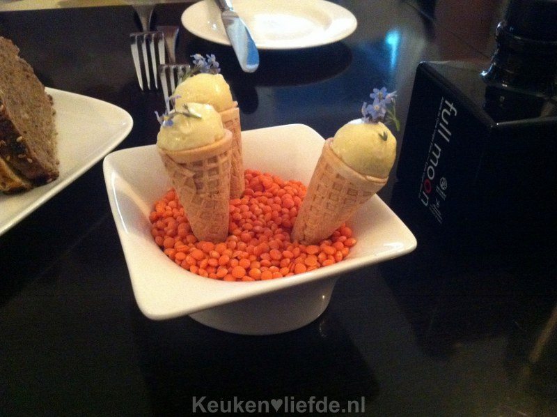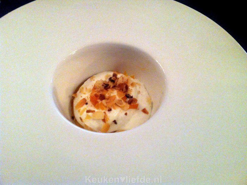 Samen met de eendenlever mijn absolute favoriet: abrikoos met geitenkaasschuim. Ook weer subliem!