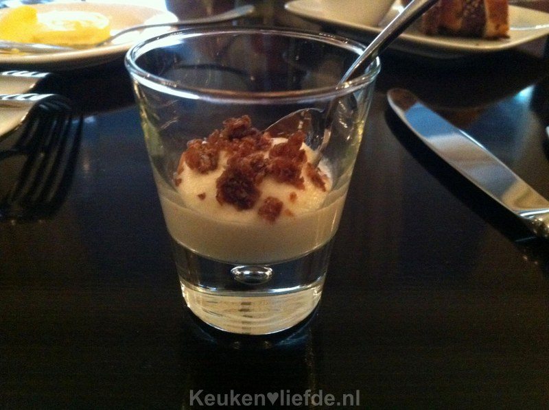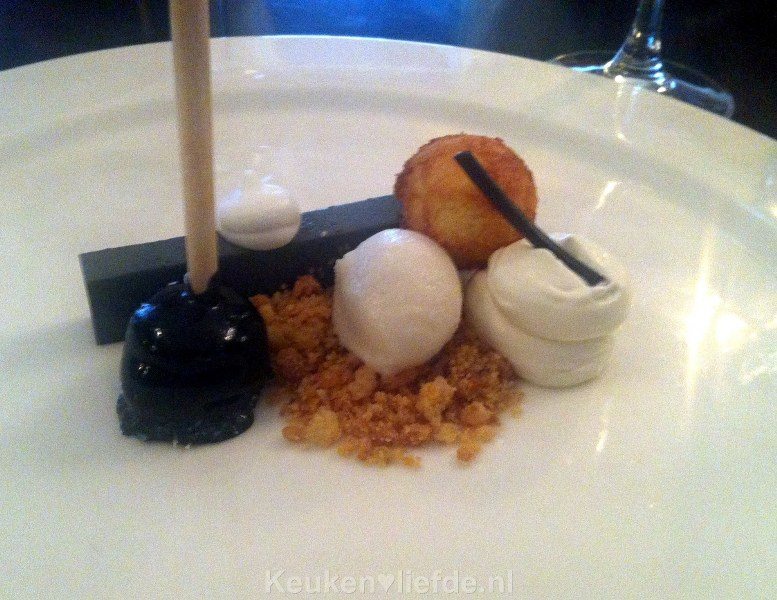 De laatste gang was er een voor dropliefhebbers. Het bestond onder andere uit panna cotta van trekdrop en een lolly van trekdrop en kokos. Erbij werd een muscat met anijs geschonken. Een prachtige laatste gang.