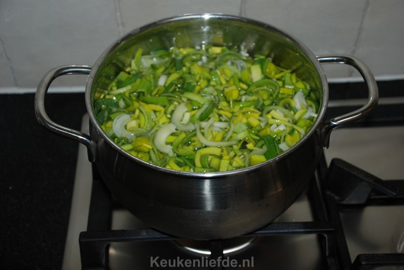 Snijd de prei over de lengte doormidden en spoel het zand eraf onder de kraan. Snijd hem in ringen. Breng een pan met water en wat zout aan de kook en kook de prei beetgaar.