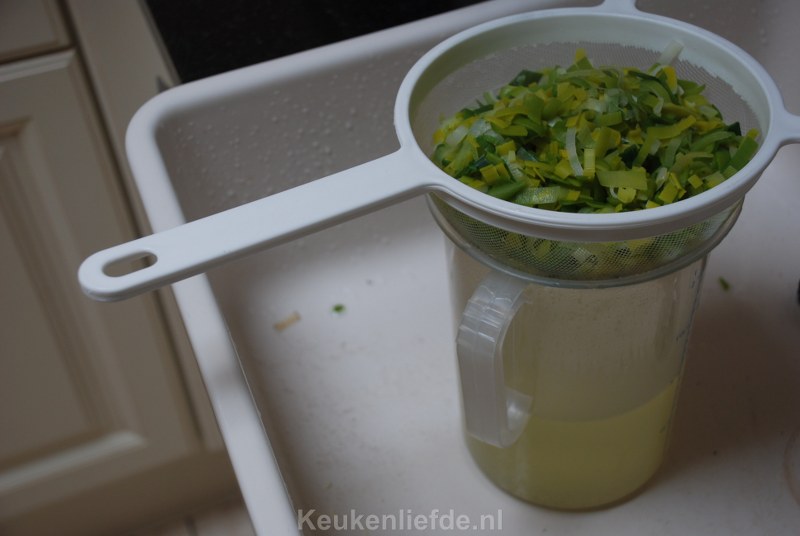 Giet hem af en vang ongeveer een 0,5 liter van het kookvocht op. Laat de prei in een zeef uitlekken.