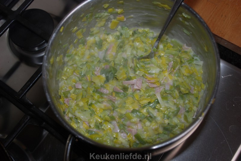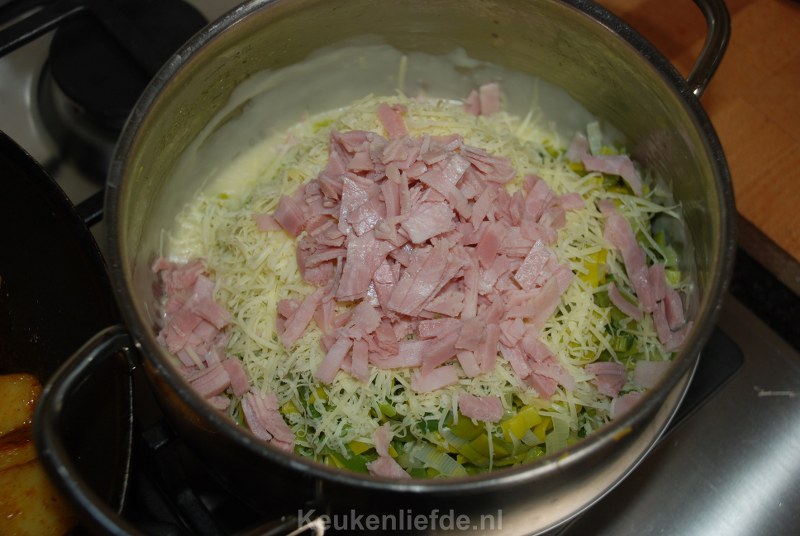 Laat de bloem in een paar minuten gaar worden. Voeg dan beetje bij beetje het opgevangen kookvocht toe terwijl je met een garde stevig blijft roeren. Voeg net zoveel vocht toe totdat je een dikke saus hebt (de saus wordt namelijk dunner wanneer je de prei erbij doet). Zet het vuur uit en roer de geraspte kaas, reepjes ham en prei erdoor.