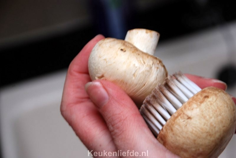 Het meeste zand zit in het groene gedeelte van de prei. Snijd in halve ringen en dep de prei droog met een theedoek. Borstel de champignons schoon en snijd ze in plakjes.