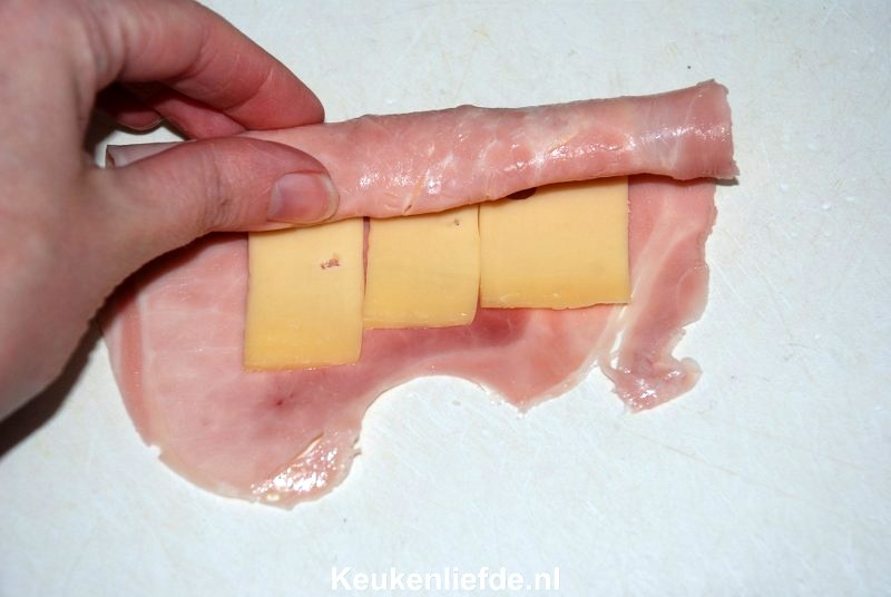 Vet een ovenschaal in en verwarm de oven voor op 200 graden. Leg op iedere plak ham een plak kaas en rol op.