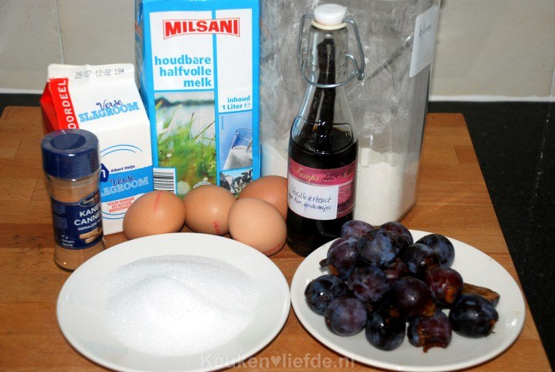 Verwarm de oven voor op 150 graden. Vet de bakvorm in met wat boter en verdeel de pruimen erover. Bestrooi met de eetlepel suiker, wat kaneelpoeder en druppel er wat vanille-extract overheen.