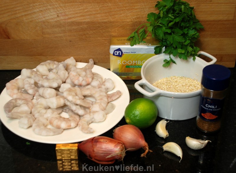 Schep de quinoa in een mooie schaal en leg de gamba’s eroverheen. Serveer met de knoflookboter en partjes limoen.