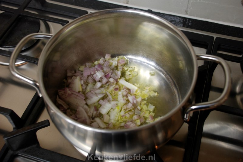 Verhit een hapjes- of koekenpan met wat olie en fruit de sjalotjes totdat ze zacht zijn.