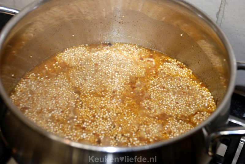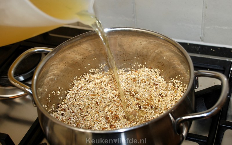 Voeg dan de ongekookte quinoa toe, samen met een theelepel chilipeper, zout en peper. Bak dit heel even mee, zodat de smaken goed in de quinoa kunnen trekken. Blus de quinoa af met een scheut droge witte wijn, laat even inkoken en voeg daarna de bouillon toe. De quinoa moet net onder staan, je hebt waarschijnlijk niet alle bouillon nodig.