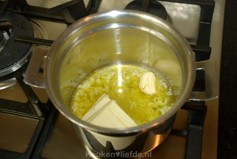 Smelt in een klein steelpannetje de boter en voeg daar het laatste knoflookteentje aan toe.