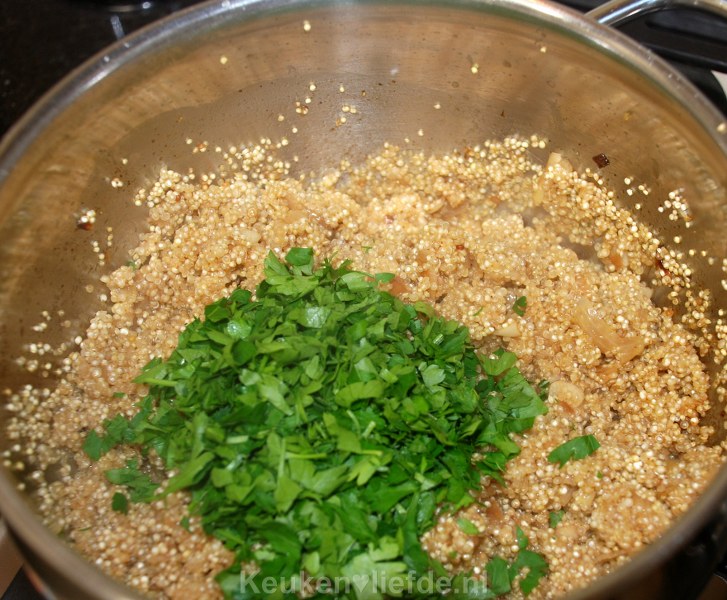 Als de quinoa gaar is en de bouillon is opgenomen, zet je het vuur uit en schep er een handvol gehakte peterselie doorheen.