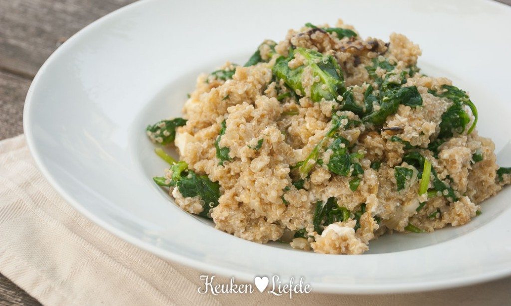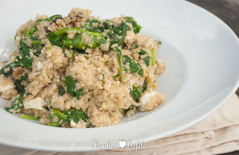 Giet de quinoa af en roer de spinazie erdoor. Als de spinazie geslonken is mag de aubergine en verkruimelde feta erbij.