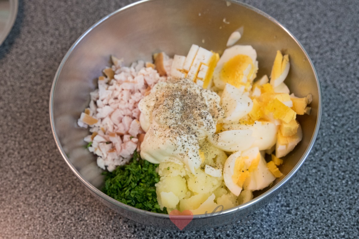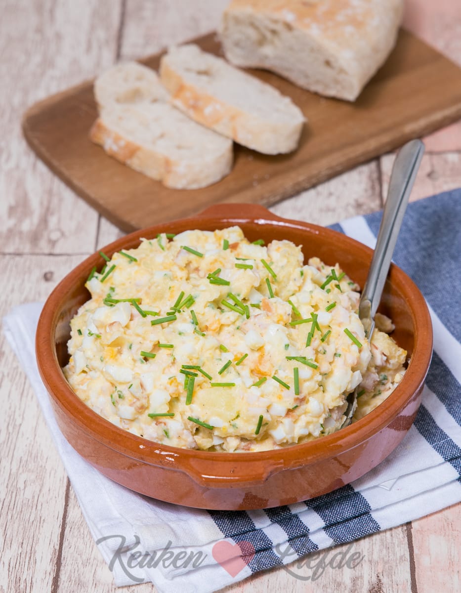 Deze aardappel-eisalade met gerookte kip smaakt heerlijk bij de borrel op een toastje, op een sneetje brood of eet hem als lunch eventueel met wat groene blaadjes erbij. Tip: maak gerust een dubbele hoeveelheid want hij is verslavend lekker!