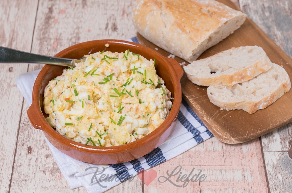 In het weekend maak ik regelmatig een lekkere borrelsalade om op een toastje of broodje te smeren. Het idee voor deze aardappel-eisalade met gerookte kip ontstond toen ik een restje aardappelpuree over had. Zonde om weg te gooien natuurlijk. Eieren heb ik altijd in de kelder liggen en samen met een restje gerookte kip uit de koelkast ontstond er spontaan iets lekkers.