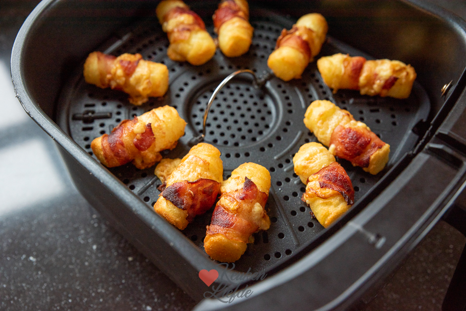 Je omwikkelt de bevroren aardappelkroketjes met een plakje kaas en een plakjes spek. Vervolgens bak je ze knapperig en goudbruin in de airfryer of oven. De combinatie van zachte aardappelpuree vanbinnen, zacht gesmolten kaas en knapperig spek vanbuiten is verrukkelijk!