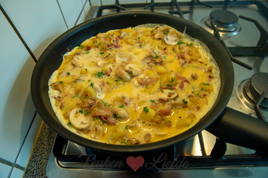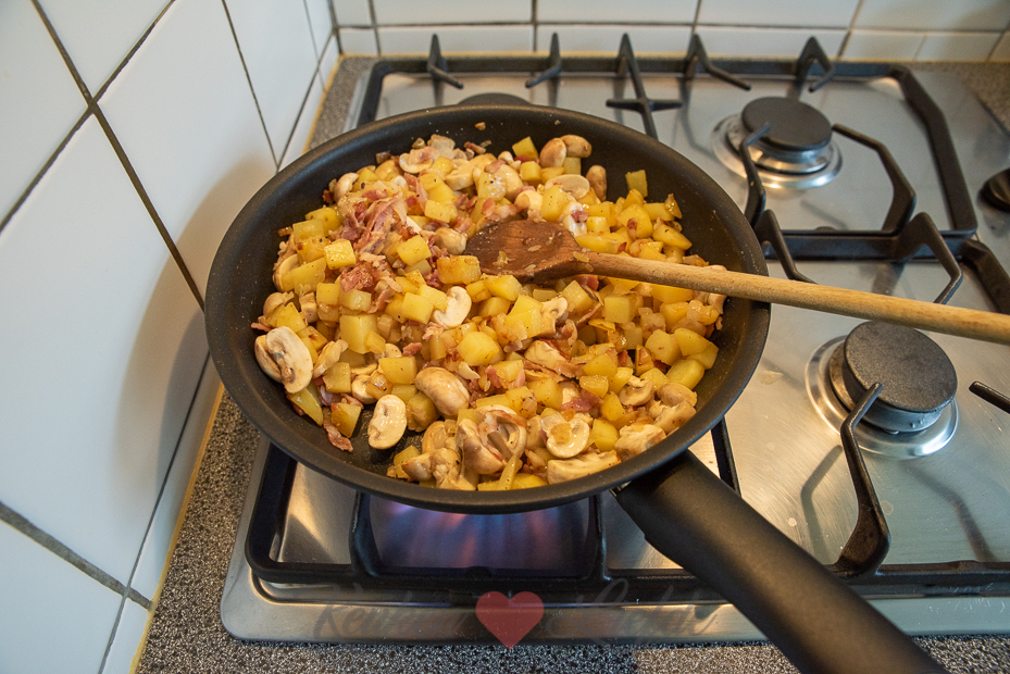 Schil ondertussen de aardappels en snijd in kleine blokjes. Voeg toe aan het spek en de ui en bak 8 minuten mee. Voeg de champignons en knoflook toe en bak nog 5 minuten verder tot de aardappels en champignons zacht zijn en beginnen te kleuren. Breng op smaak met zout en peper. Roer de peterselie door de aardappel.