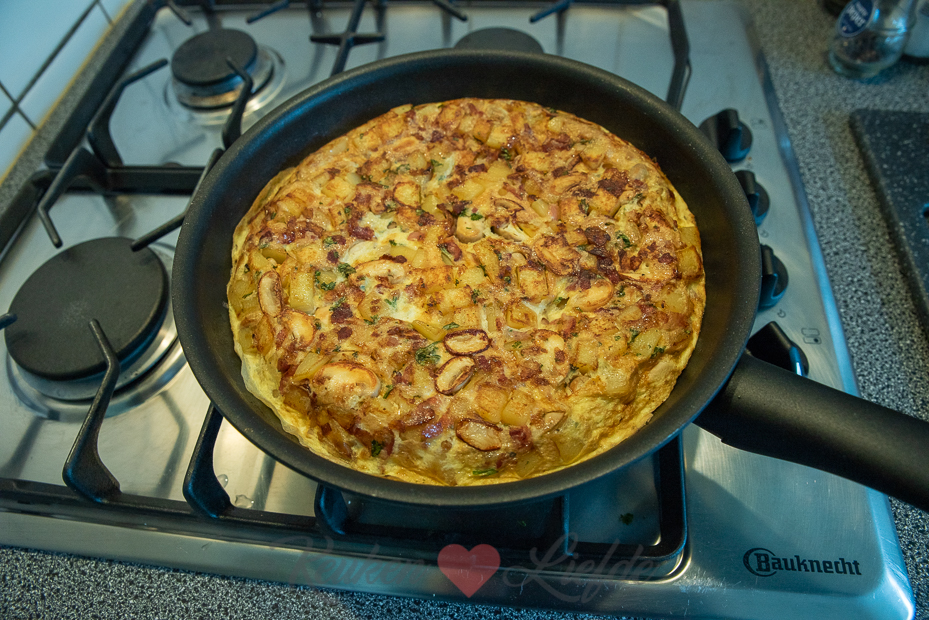 Klop de eieren los met zout en peper en giet over de aardappels. Zet het vuur laag en doe de deksel op de pan. Laat de aardappeltortilla in circa 10 minuten stollen. Draai de tortilla dan om op de deksel en laat vanaf de deksel weer in de pan glijden zodat de onderkant nu naar boven ligt. Doe de deksel op de pan en laat nog enkele minuten verder garen, tot het ei volledig is gestold.