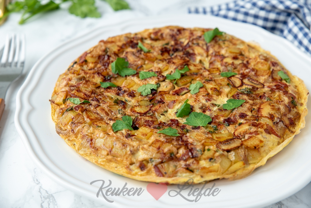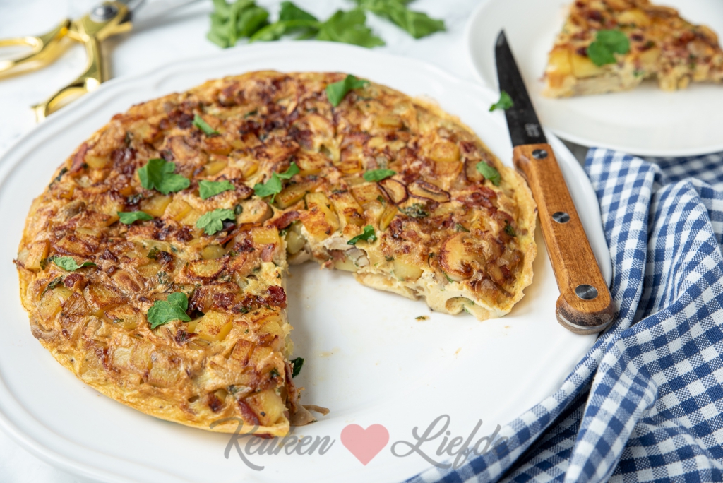 Schuif de aardappeltortilla op een bord en laat iets afkoelen.